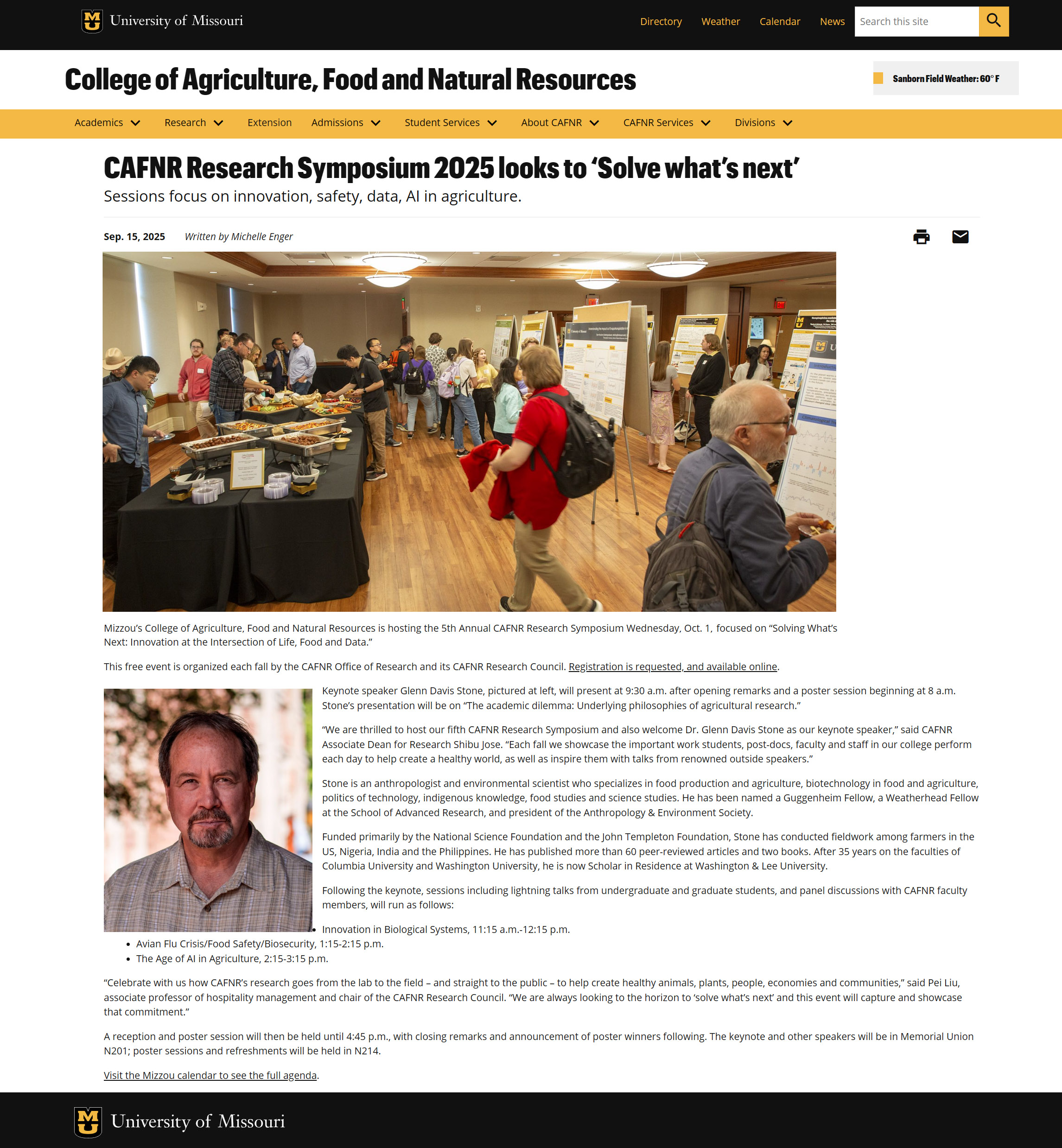 - 2025 Univ. Missouri College of Agriculture, Food & Natural Resources, keynote address, "Academic Dilemmas and the Underlying Philosophy of Agricultural Research", Oct 1.